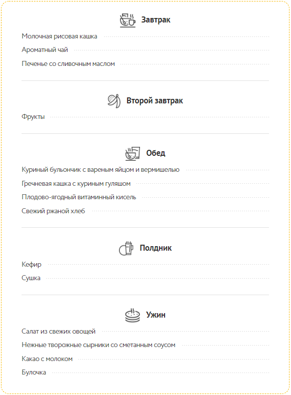 Меню основано на ГОСТ стандартах, но из него исключили сосиски и большое количество тушёной капусты, заменили